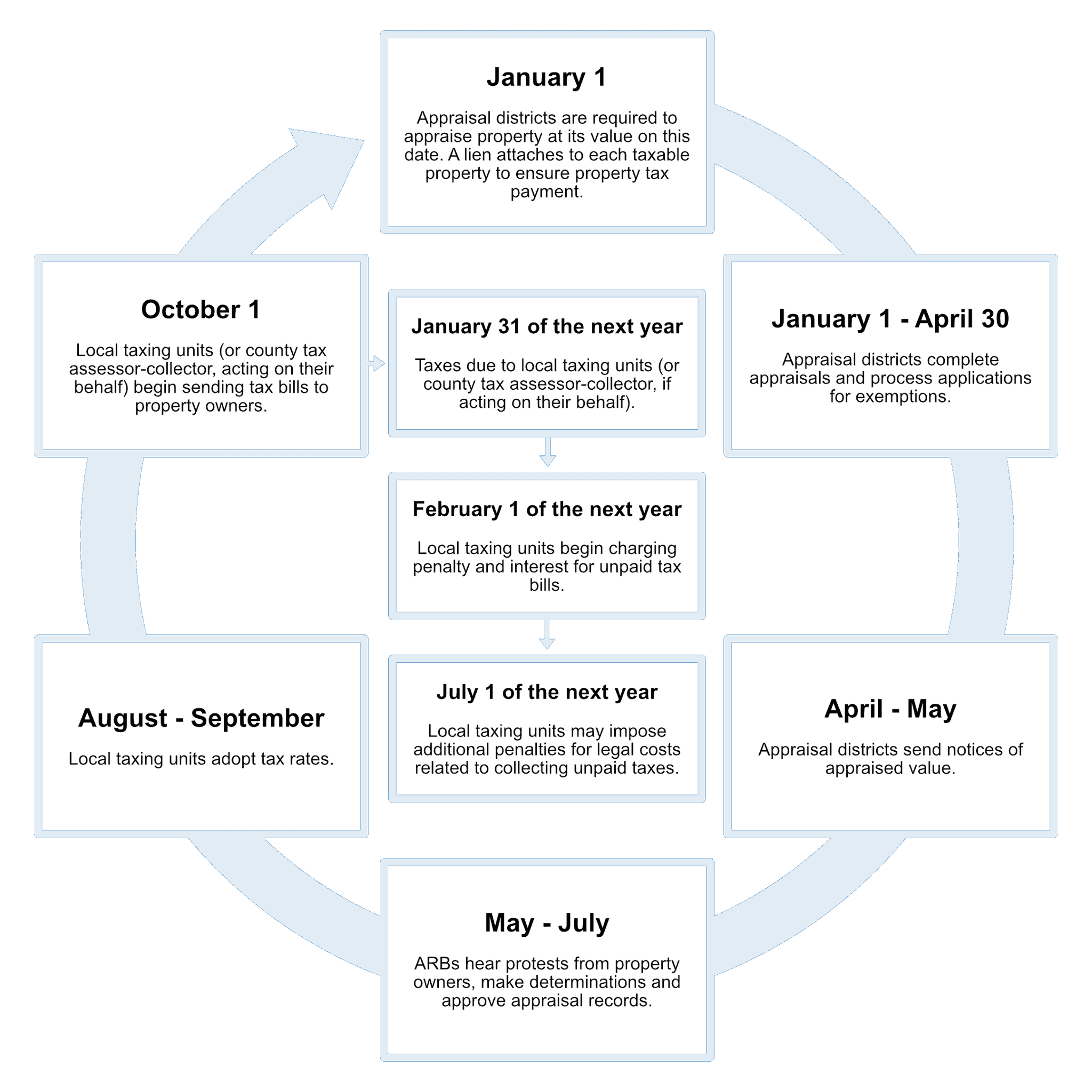 You can protest the value if you think it’s unfair or overvalued. Local entities set tax rates, and exemptions may apply. You should expect to receive your property tax bill in the mail by the end of November. You have until the end of January 31st of the next year to pay it without penalty.